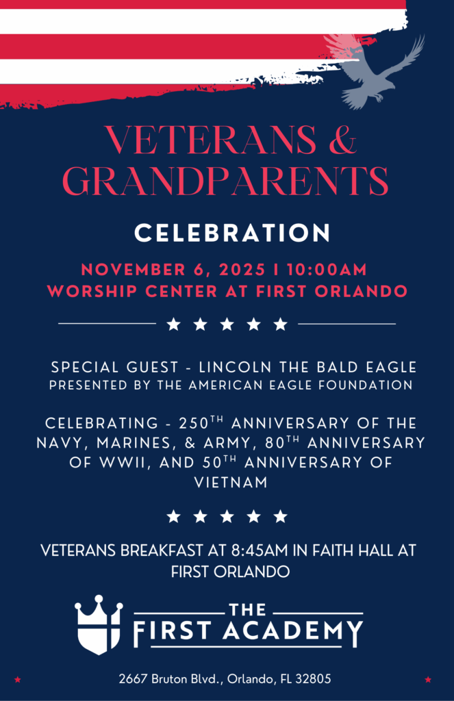 The First Academy will host a Veterans & Grandparents Celebration on Thursday, November 6, 2025, at 10 am. A continental breakfast will be held prior to the celebration for Veterans and their spouses at 8:45 am in Faith Hall. Veterans, please RSVP here.